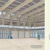 The form interlocks the human grid into the solar grid, while the structural and enclosure treatments of the two express their distinct difference. While the large Natatorium and Gymnasium are portal frame construction, the fine grain programmed spaces are post and beam. Red sandstone and limestone naturally occur in Sault Ste. Marie, so the building maintains the historically rich neighborhood fabric.