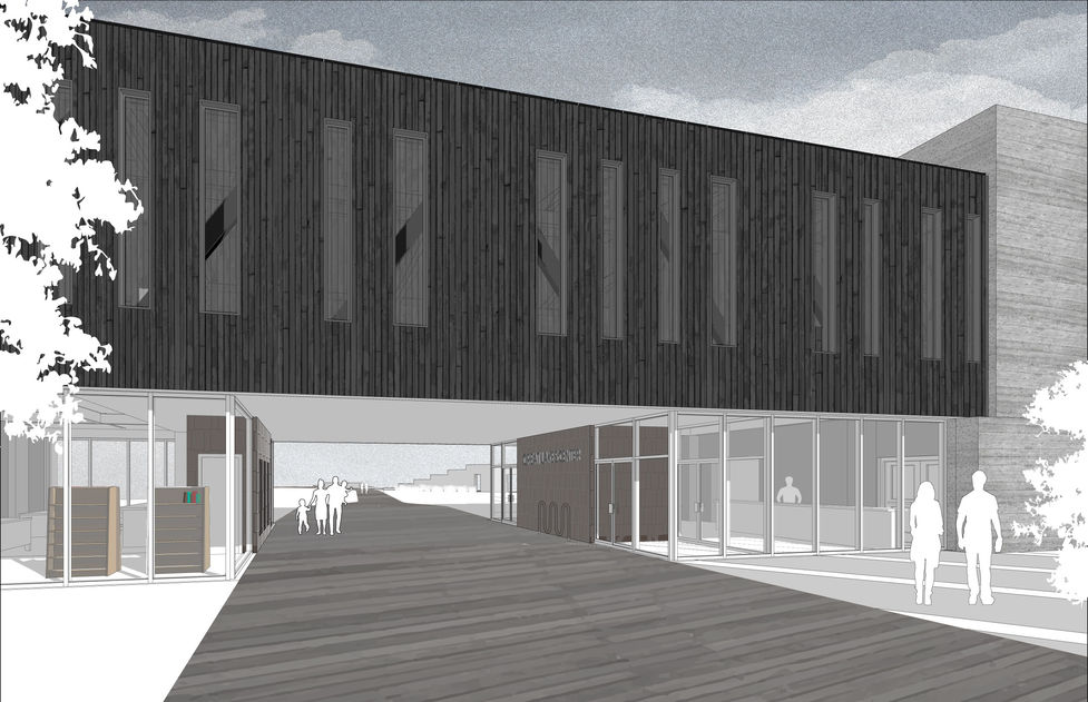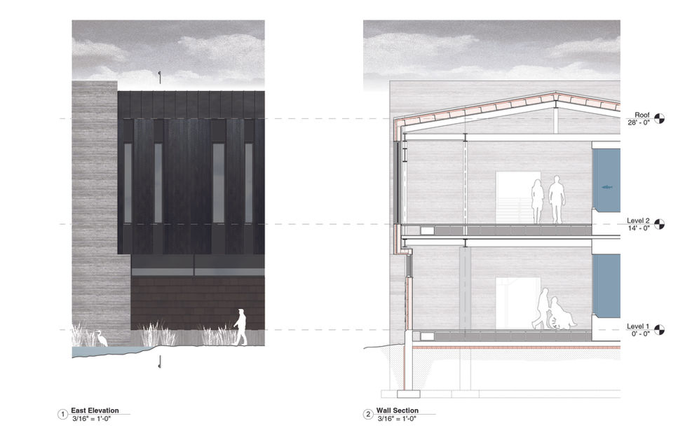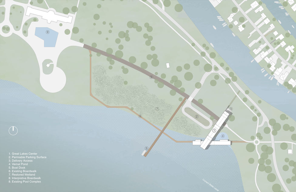 This project serves to connect the residents of the Metro Detroit area with the history, ecology, and wildlife of the Great Lakes region. The building is designed with sustainability in mind and is oriented to take advantage of solar heat gain and waterfront views. The structure’s overall form responds to climate and site considerations as well as visitor experience. The building massing is characterized by two intersecting “bars” which meet at a vertical atrium space. A single story portion runs east-west and provides exhibit and multipurpose spaces with framed views of Lake St. Clair. A two story wing bridges over an existing pedestrian thoroughfare and contains aquariums, labs, and retail spaces. The building is supported with long-span trusses and pilings in order to minimize disruption of coastal wetland habitat.