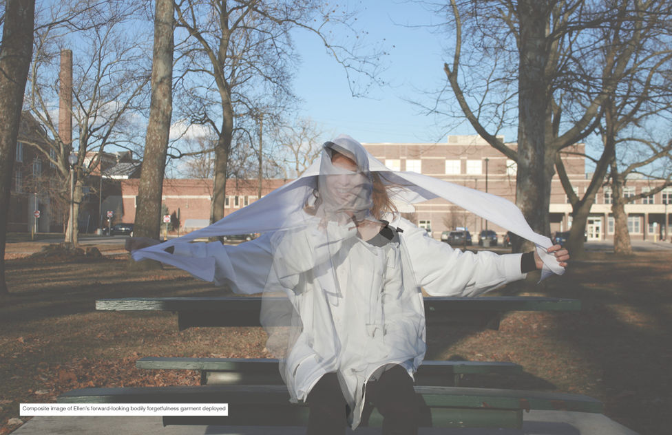 Crawford advocates for the viewing of the transgender body as an archive via two analytical methods. The first is self-critical remembrance, which discourages dissimulation. The other is forward-looking bodily forgetfulness, which stimulates evolution. With this in mind, I developed a series of exercises that begin with and extend from the body. In collaboration with colleagues, I first created critical self-remembrance garments that locked us into postures that have been imposed on us and influence how we occupy space. A second iteration of forward-looking bodily forgetfulness garments were made to lend us more experiential authority.